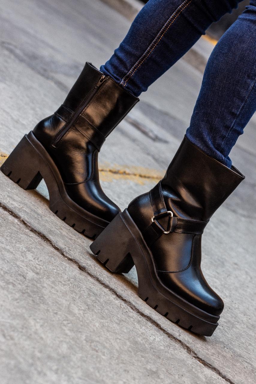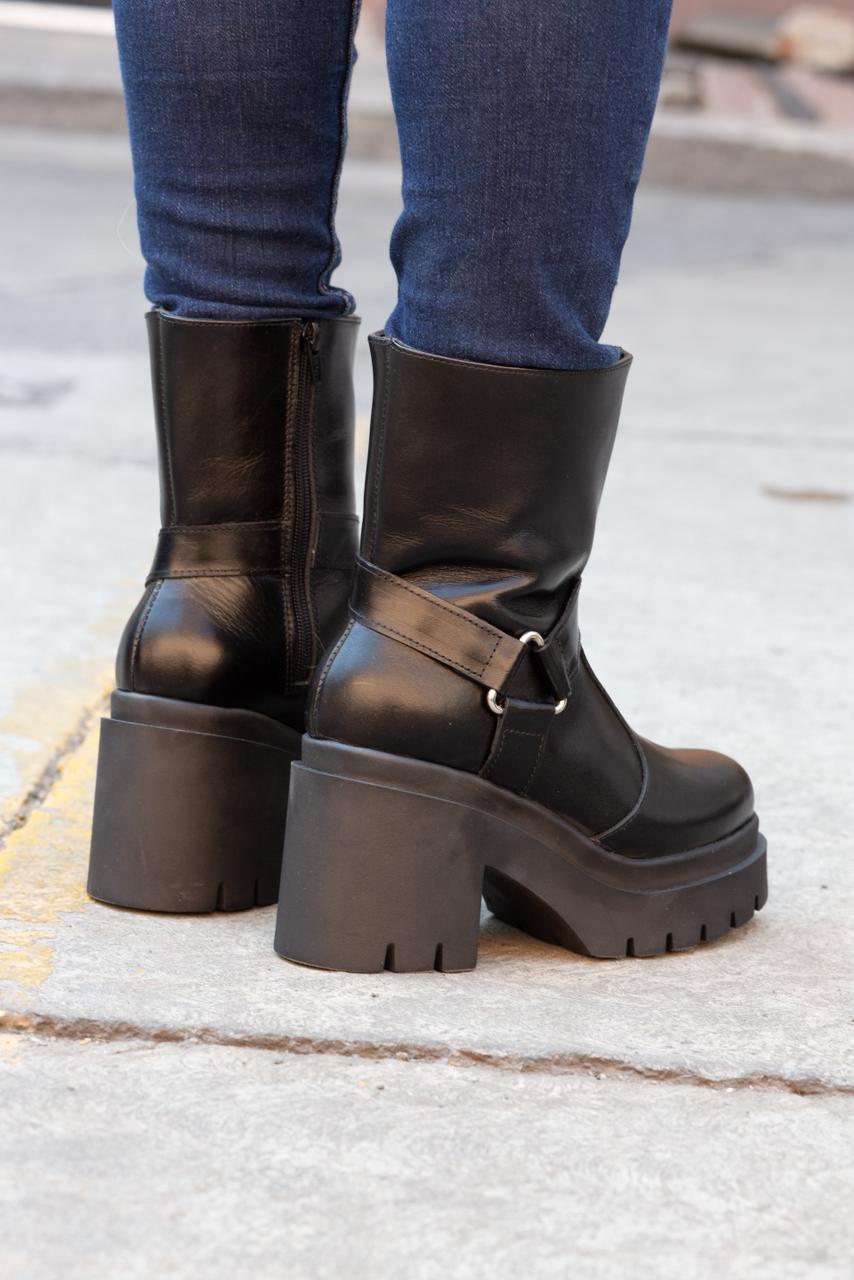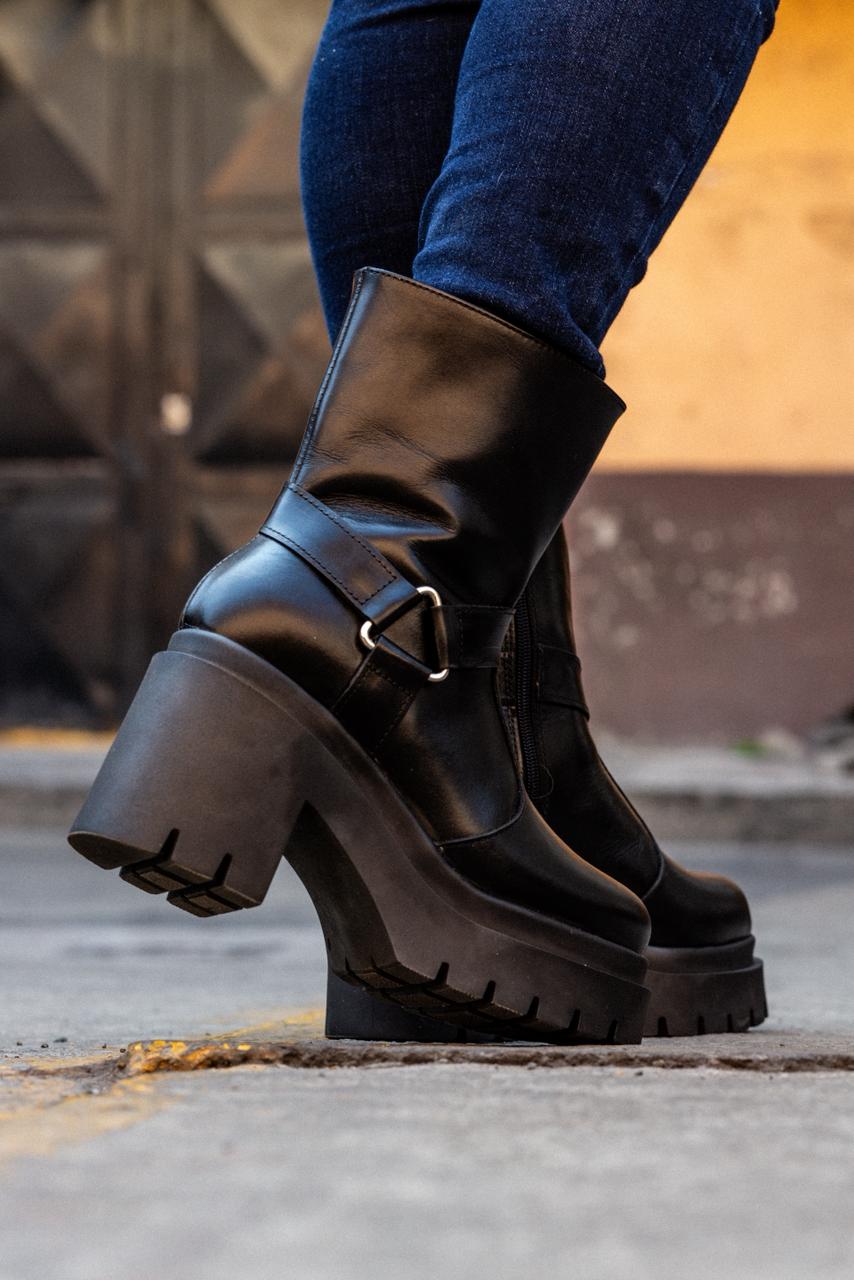 Define tu estilo con la fuerza del modelo Sigrid. Diseñado para la mujer que no teme destacar, este calzado combina la robustez del tacón chunky de 9 cm con la elegancia atemporal de la piel pull up en color negro. Su acabado premium desarrolla una pátina única con el tiempo, contando tu propia historia.